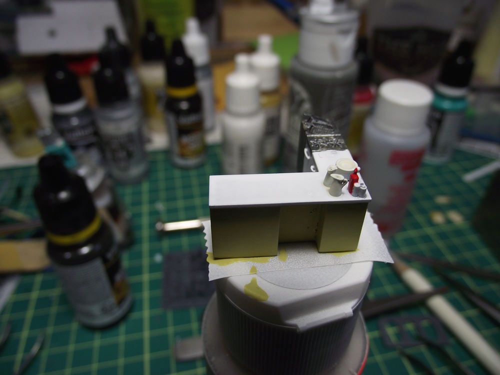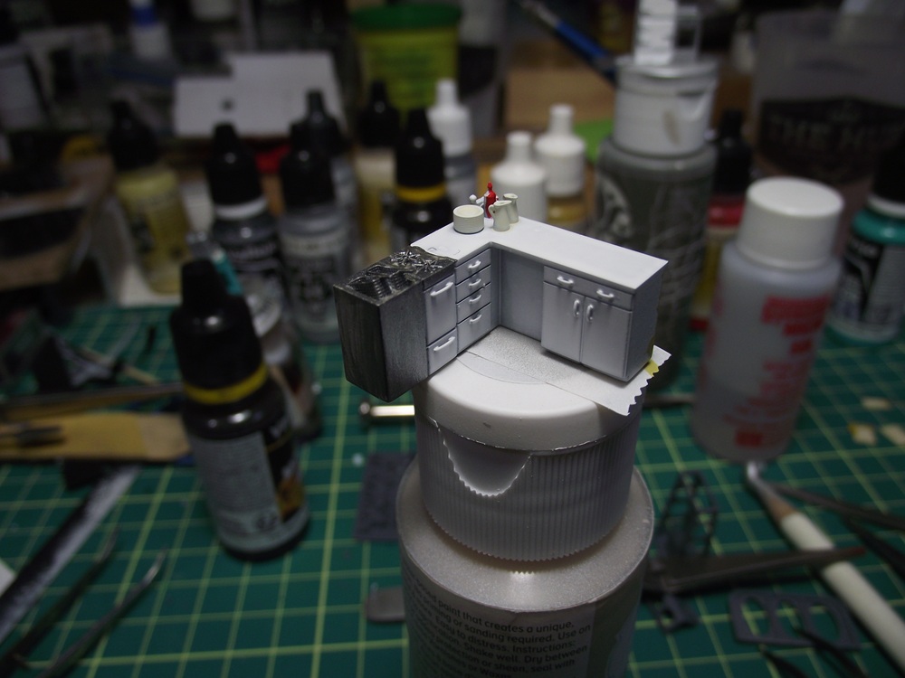 I started with the front counter and fryers. I airbrushed everything white and then detail painted. On the counter are a stack of plates, napkin holder and a ketchup bottle.