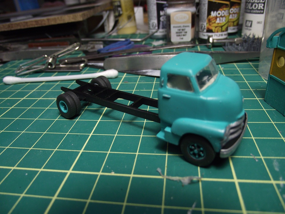 While I was detail painting the interior parts, I painted the chrome and othe details on the truck itself. After the I assembled the truck cab and chassis. Everything fit well except the interior was a tight fit. I should have sanded some of the tighter parts but instead I forced it and cracked the cab on the driver's side door. That was my fault, I should have been more careful.
