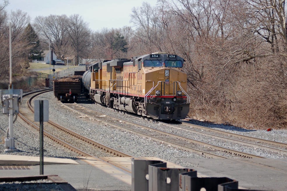 A pair of Union Pacific locos head NS 39G. It's waiting at Cove Road, Pennsauken, NJ, for clearance to head over the Delair Bridge into Pennsylvania.