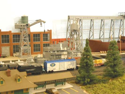 SMCH Consolidation # 593, backs BBG100101, and a flat car with two of "The Box" ( Gauge Ind crates ) on to the siding at the "Shipyard Station"