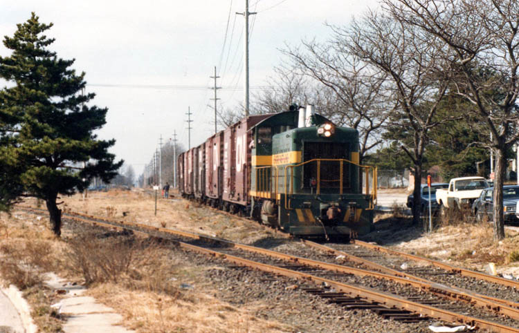 Shore Fast Line's SW1200 with boxcars of paper for the Atlantic City Press at Pleasantville, NJ, December, 1989.