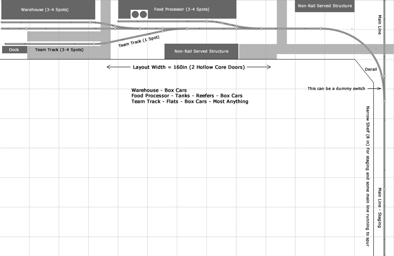 Here's an example of what I was talking about using your current space:     Even though it looks very simple as far as the track plan is concerned - it's quite prototypical and has some interesting industries on it that support a wide selection of equipment. Industrial spurs like this are found all over the country. It only requires 4 turnouts and a few feet of flex track. As noted, the "main line" switch can be non-operating, if you have a messed up turnout laying around that you don't want to toss in the dumpster.
