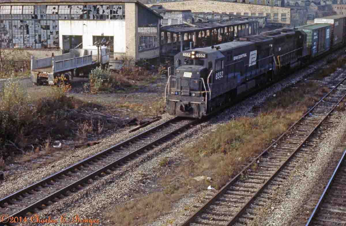 An eastbound train passing the ruins of the W S George pottery in East Palestine, Oh 11/05/1977     Charlie