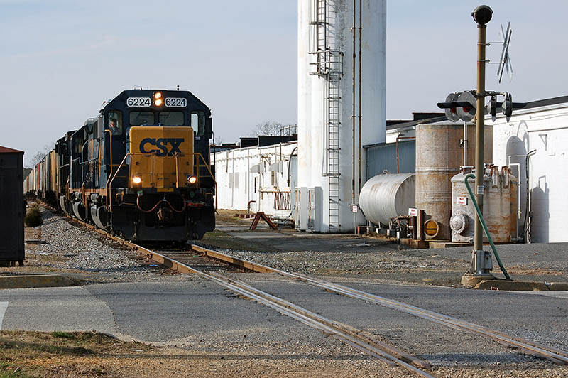A trio of CSX loco's picks up a grain train of 80 cars that was set out on the Vineland Industrial Track by Winchester and Western RR. Vineland, NJ, December 14, 2009.
