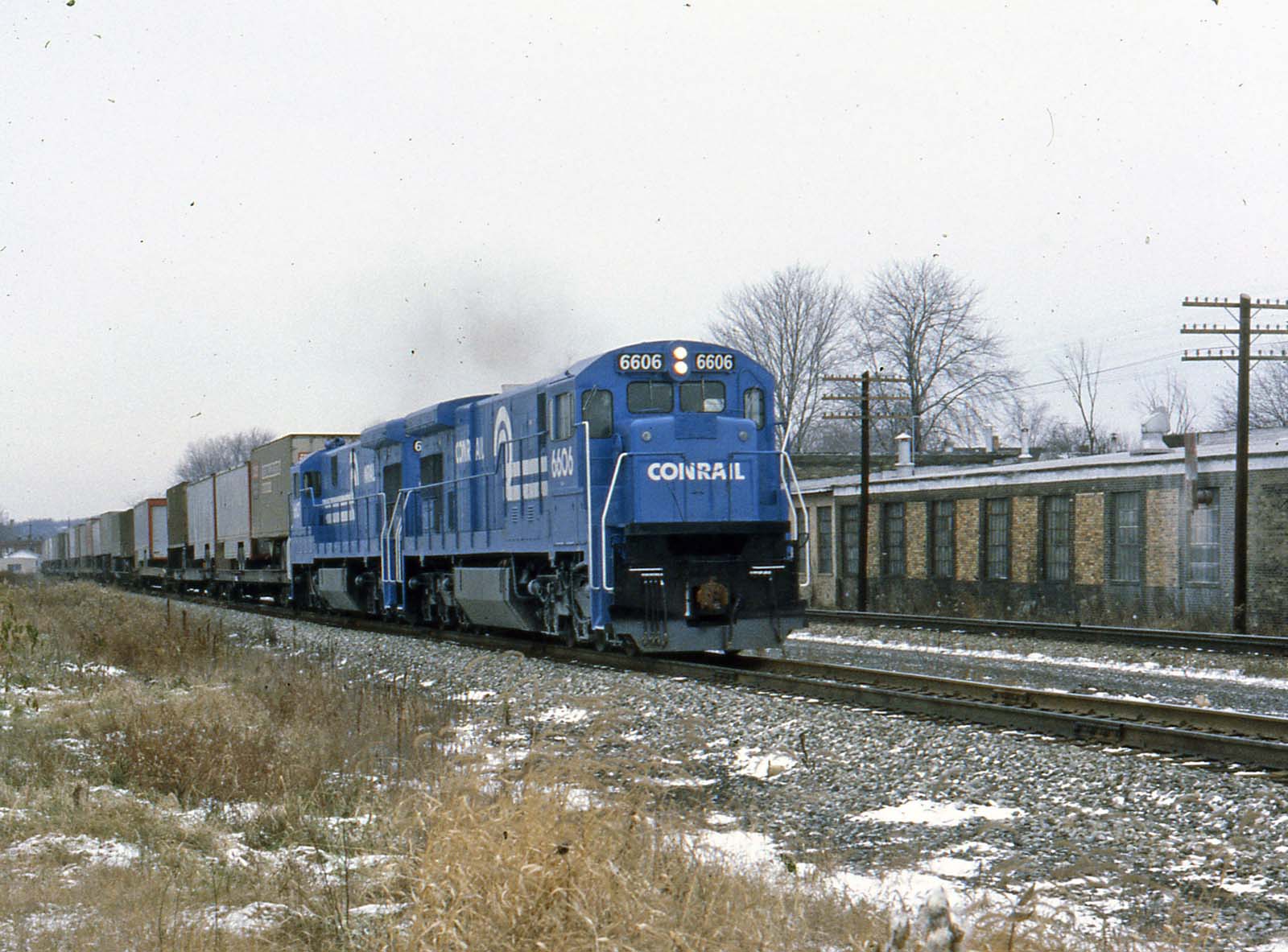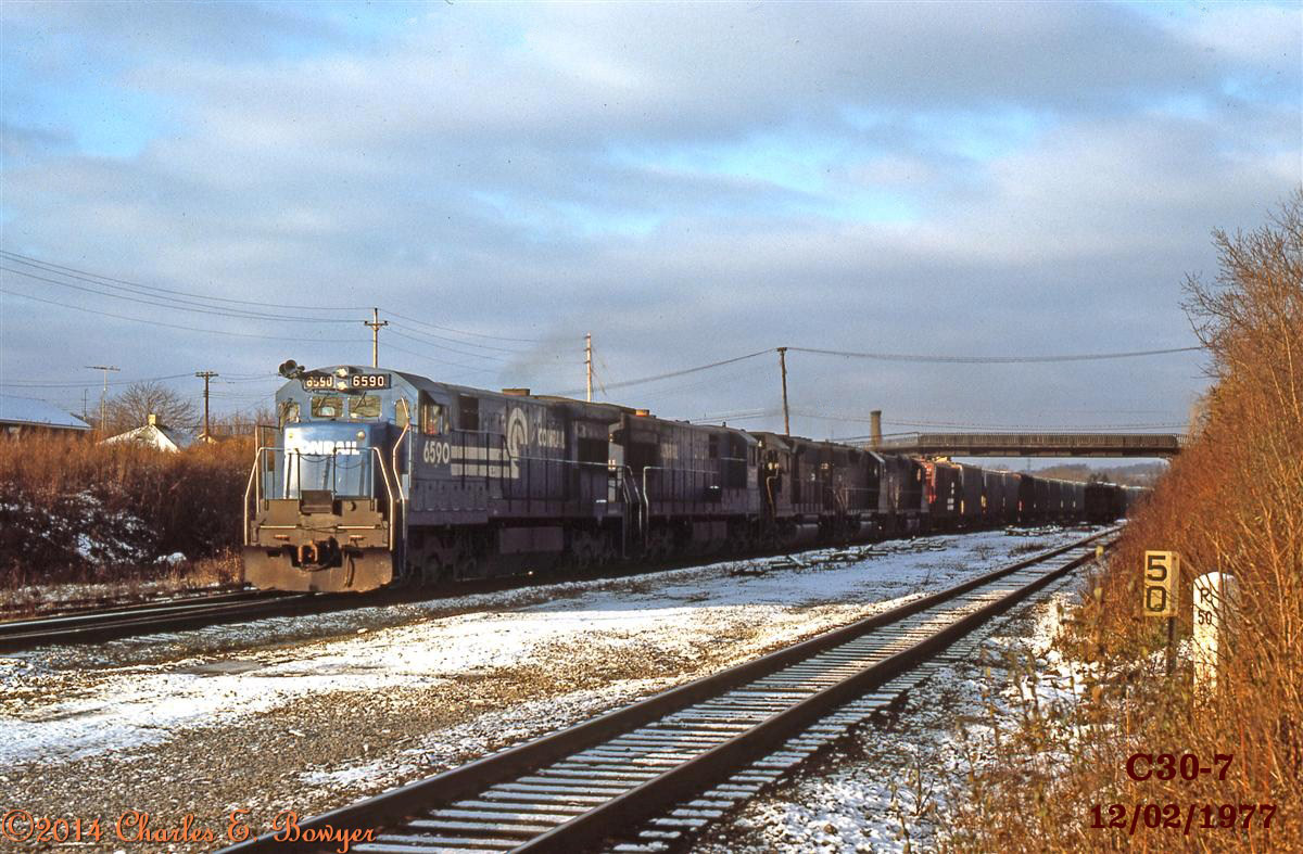 December 4, 1977 Conrail 6606, C30-7 leads TV62 across the Pleasant Drive crossing in East Palestine, Ohio      Charlie