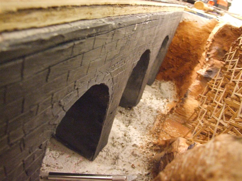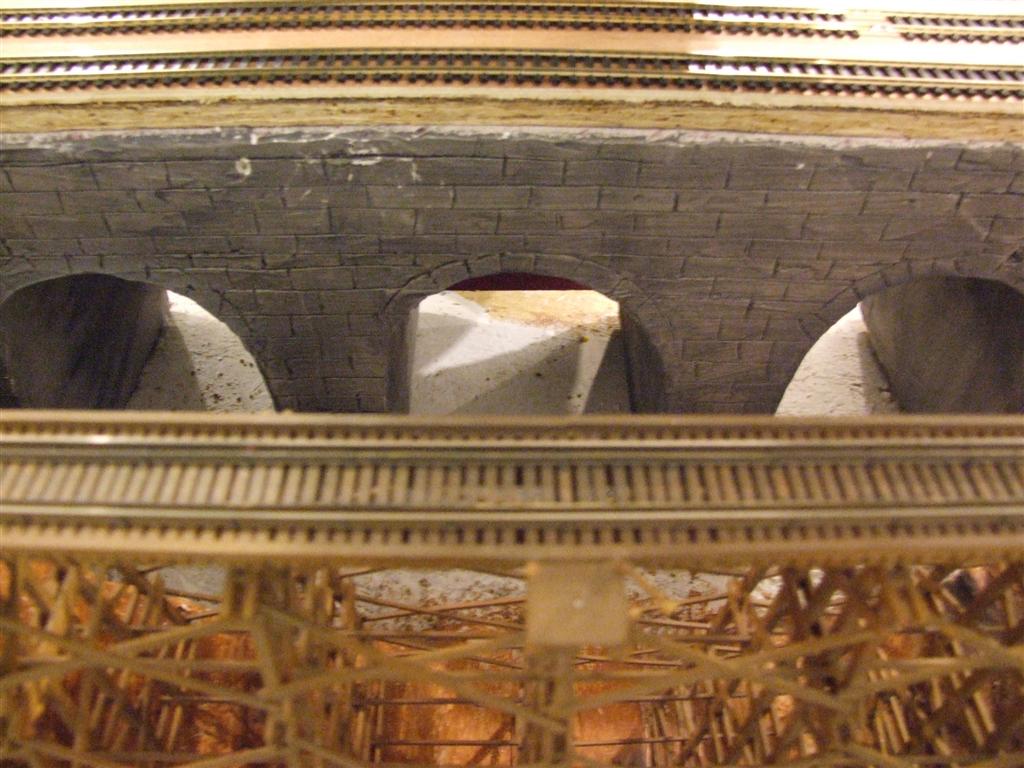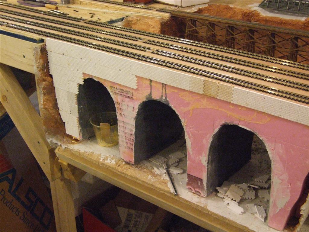 Here are a few pictures of the viaduct. On the back side I coated the foam with Dura-bond and then scribed the stone before I installed it. I figured it would look OK as no one will see it without craneing their neck out of joint. The front side I'm laying the stone plaster castings from top to bottom, I figured it was easier to make the top come out straight by starting there. It is all new to me. I wish I would have scribed the front too after seeing the pictures, but if the stonework looks too bad I can cover it too. Goldth