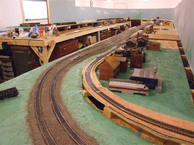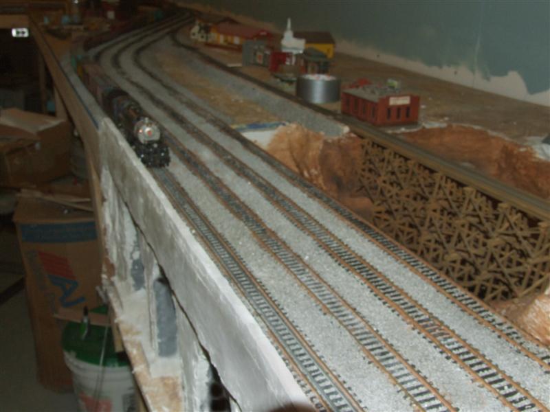I installed 3 crossovers between the mains so the yards had access from both tracks in both directions, and all of the double track main is now ballasted which is about 60 feet of line, or half the layout. I still have 60 feet of 4 track main to ballast as well as 150 feet of branch line, then I will start the landscaping.
