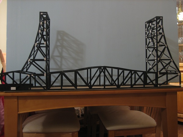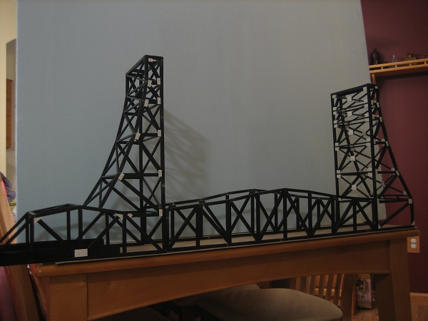 The two sides of the lift section of the bridge are complete, I'll get to joining them together soon. It's a pretty massive structure, considering that it's very much "compressed" from the prototype that I've modeled it after.
