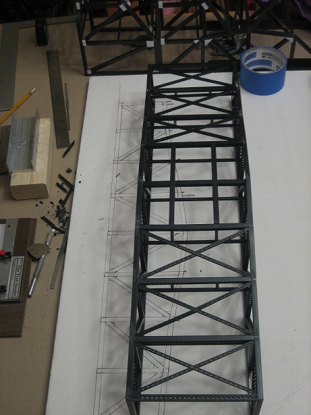 Thanks to all again.. Moving along with the next step, "Joining the two sides of the lift section". I do intend to have this bridge operate one day, so this section has to be as square as possible. This necessitates me doing each of the cross braces one at a time. I use two squares , held temporarily in place with painters tape, to hold the sections true as the glue sets up. I only remove them after they are fully dry.
