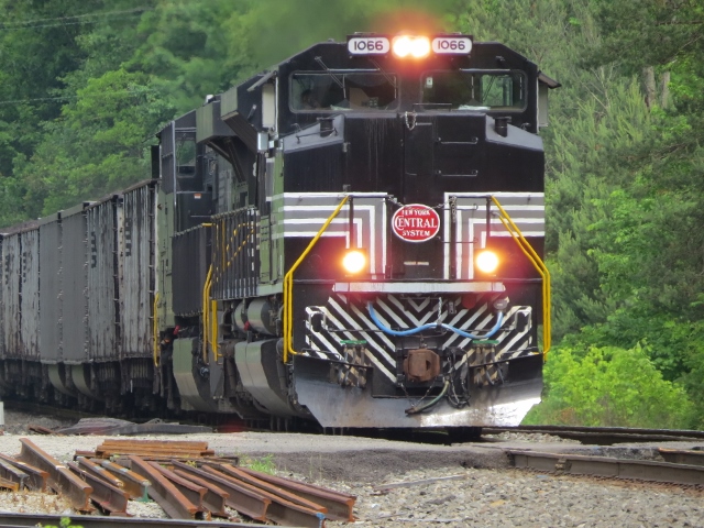 1066 leading NS 590 (loaded coal train) yesterday around 11;00am East on the Conemaugh Line at Saltsburg,Pennsylvania.