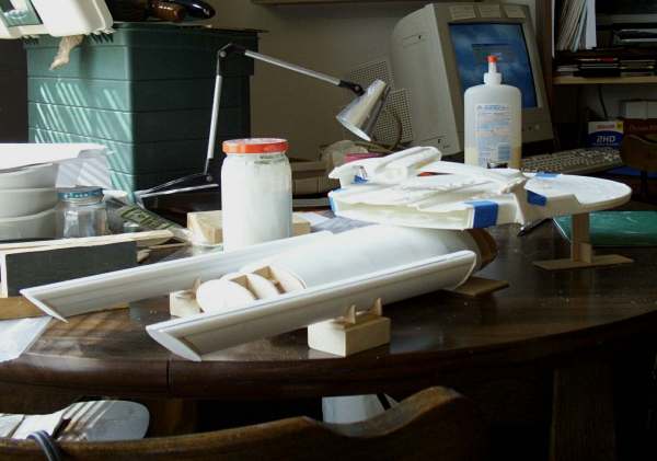 I just happened to notice this thread this morning, and I just took a picture of my work area, as part of a thread on another forum. So, here is my work area, and my current "project", USS Kodiak NCC-6000.