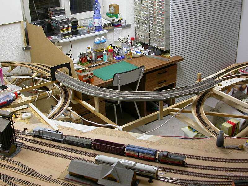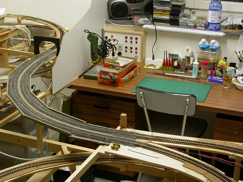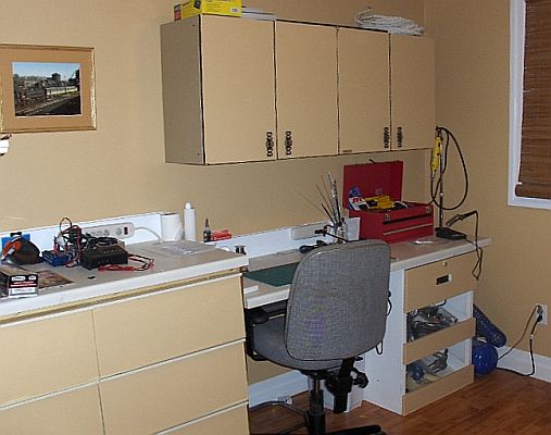 Here is my work place, right in my layout room and almost enclosed by the layout.
