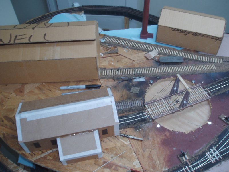 After staring at my enginehouse this afternoon, it became obvious that a roundhouse is not physically be possible in the space that I have. A single stall enginehouse is a possibility, but I really need two tracks, and whether single or double stall I will wind up with the same curve on at least one of them. So, I decided to go with things the way I originally planned. I took a cardboard box and a hot glue gun and made some quick mockups of some other smelter structures to see how things fit. After seeing how things lay out, I still like the size and shape of the enginehouse, so I think I will start construction tomorrow.