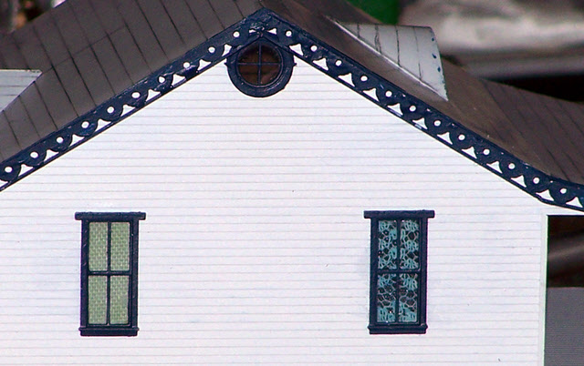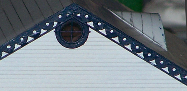 thanks pete here is the way i made the barge boards the thing in the upper left is a paper punch the white thing next to it is a spacer that is taped to the punch then a scale 2 by 12 is run through it after that a scale 2 by 2 is glued on making the board in the second photo ( end up being a bit in the fragile as i found out broke off a corner ) the lattice is simply a sheet of aluminum countour mesh cut out and framed and painted white .