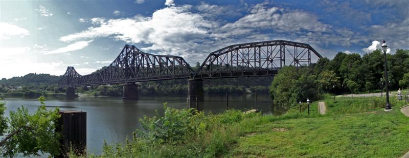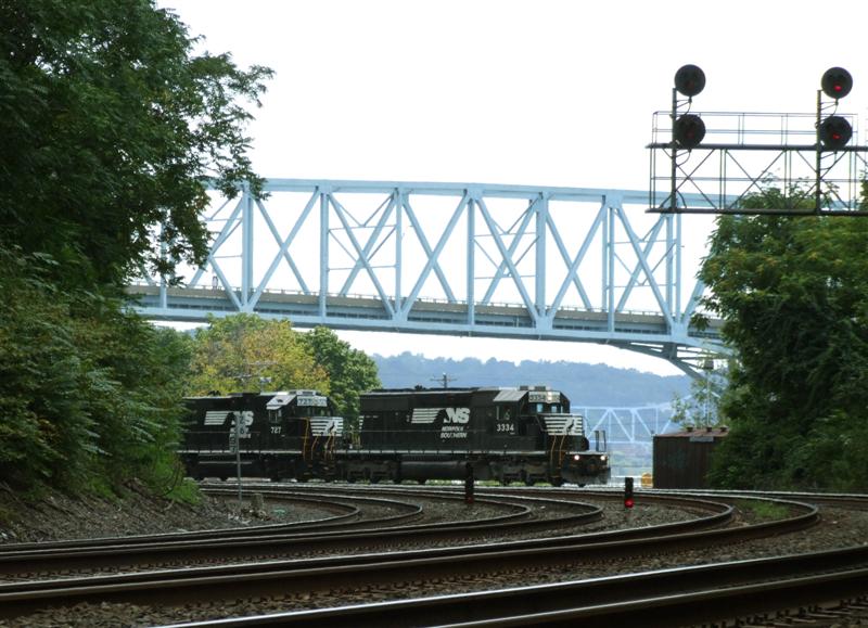 This shot of the P&LE Ohio River bridge between Beaver and Monaca, Pa Looking east at the local heading down the Bayard branch. She will work the mill at Midland, Pa and head downstream to East liverpool and Wellsville, then probably to Mingo and return if they have time. The 2573 is waiting for the local to clear so she can take her train into the yard at Conway. It is coming of the PYA line that comes from Youngstown and points north And the surprise is the NS business train heading for home. It is about to pass under the bridge at MP 44.1 in Enon Valley, Pa. Charlie