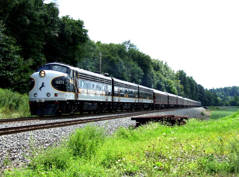 Thanks for all the feedback---glad you're enjoying the trip.Our tour director (Charlie) certainly knows all the right spots for railfanning,although there was one disappointment.After a perfect day in spite of a few inconsiderate foamers,Charlie took us to another great spot to get one more shot of the Berkshire---a secluded access road right next to the tracks with a slight curve---an ideal spot---we could hear the whistle and saw the smoke and I was really getting excited with the prospect of getting a side shot as she slowly passed on the outside track.Then it happened---before the 765 appeared,a regular freight came around the curve first and slowly passed---blocking our perfect shot.