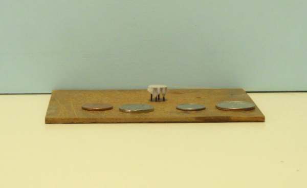 Built and installed all but one of the tables in the diner/lounge area. These shots are one of the tables, with some spare change for size comparison.