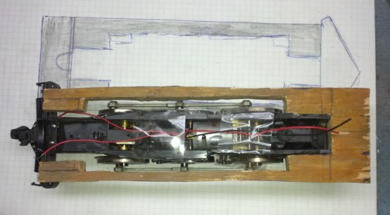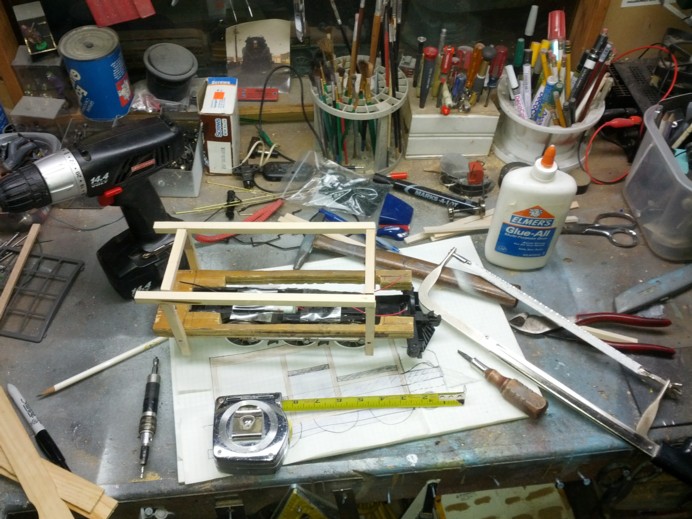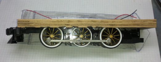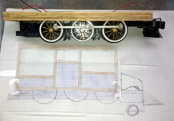 Just a few minutes with the jig saw and we have the wood, cut and placed on the frame of the engine. Since it's tight and also supported on the cow catcher and the lip in the rear, it's fine..... also, note that it's now 14" long not 12 as in the drawing.... Another re-design on the fly