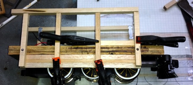 Skirts are finished, and he verticle supports are in place on one said. The 2 clamps that are above the plywood are holding the first "plank" in place while the glue dries