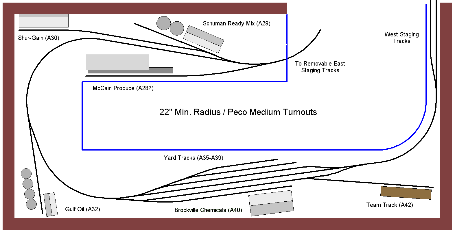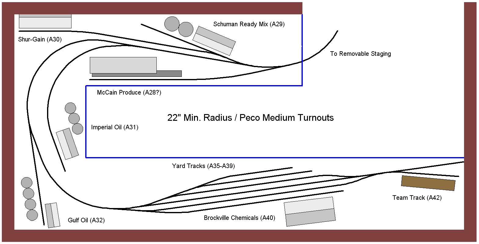 I decided Imperial Oil had to go. Yard tracks and team track have moved slightly and staging has been added. I am happy with it now and look forward to my track getting here so I can get things started.