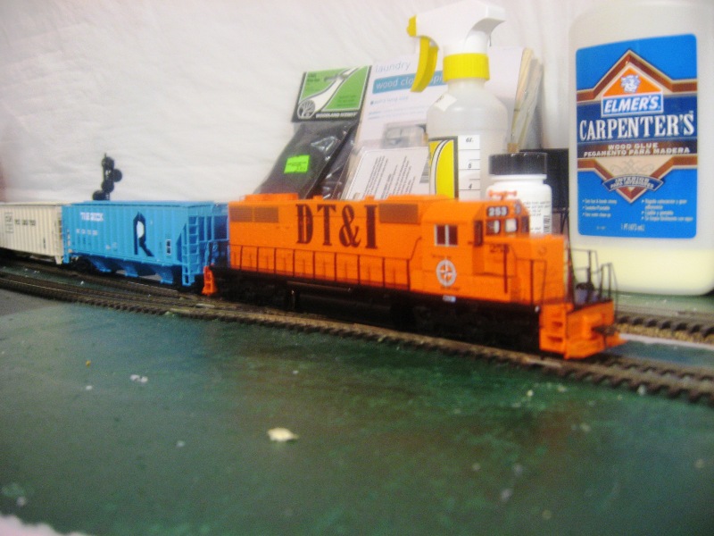 Finally, for now, is my brand new DT&I SD38 busy switching out Keynes Mill. I picked up this little beauty at the train show last weekend. I was on my way out the door when I happened by a vendor's table that I apparently hadn't seen before. The bright orange engine caught my eye and I was drawn to it like a moth to a bug zapper. Goldth I don't model DT&I but I didn't care, this thing was coming home with me.
