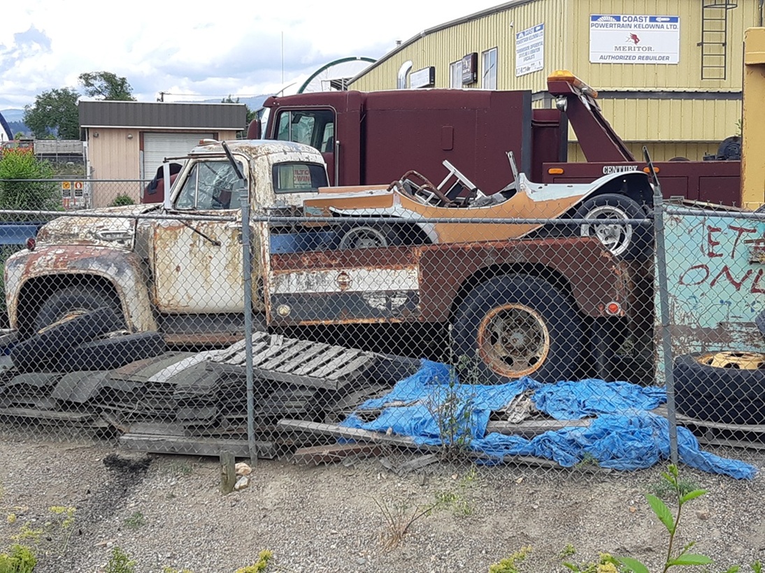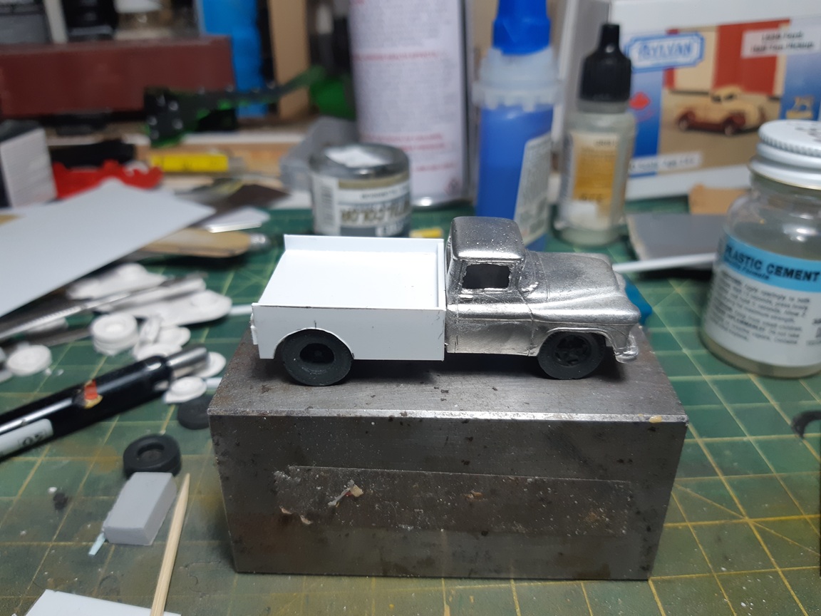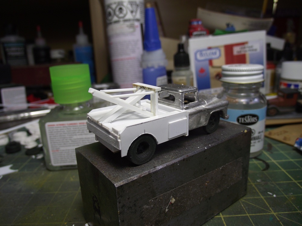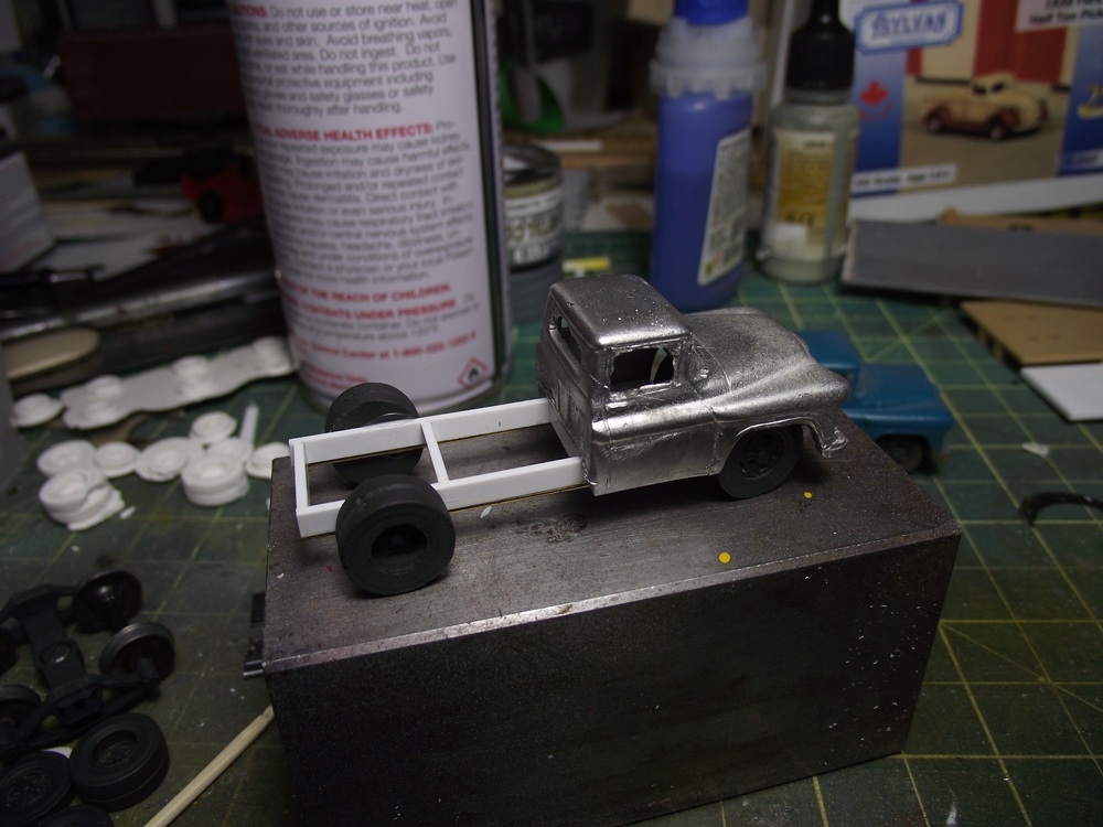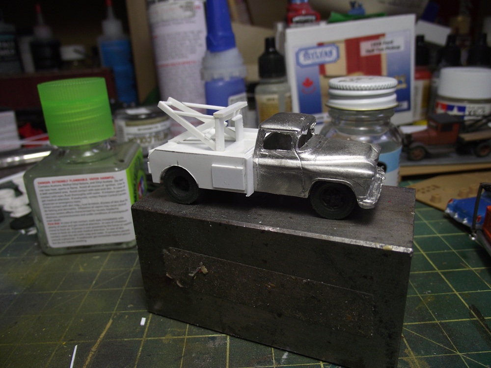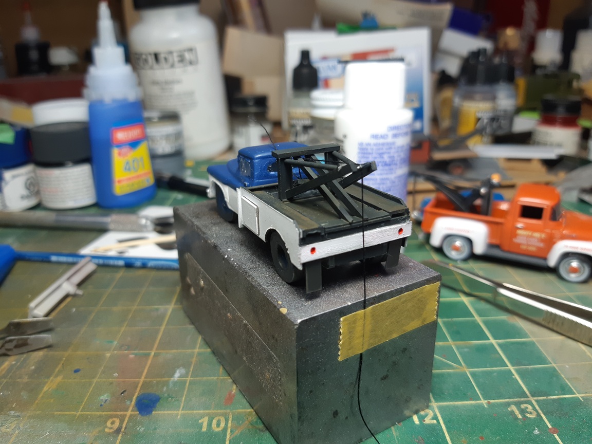I glued the chassis and the wheels to the cab temporairily with some white glue. (I'll have to take it apart later for painting) When I glued the chassis and cab together I felt the styrene chassis was a bit too bendy so I glued some brass rod to the chassis. I probably didn't have to do that considering what I'll have to build on top of the chassis. I glued two 'c' channel pieces to the tops of the frame to bring it level with the tops of the tires. I also used some styrene rod to make a rudimentary rear axle and driveshaft. This is what I'm going for for the wrecker body. I pass this truck in a storage yard almost every weekend on my cycling route. It's an early fifties ford but the rear wrecker platform would be universal. it shouldn't be that diffifult to replicate
