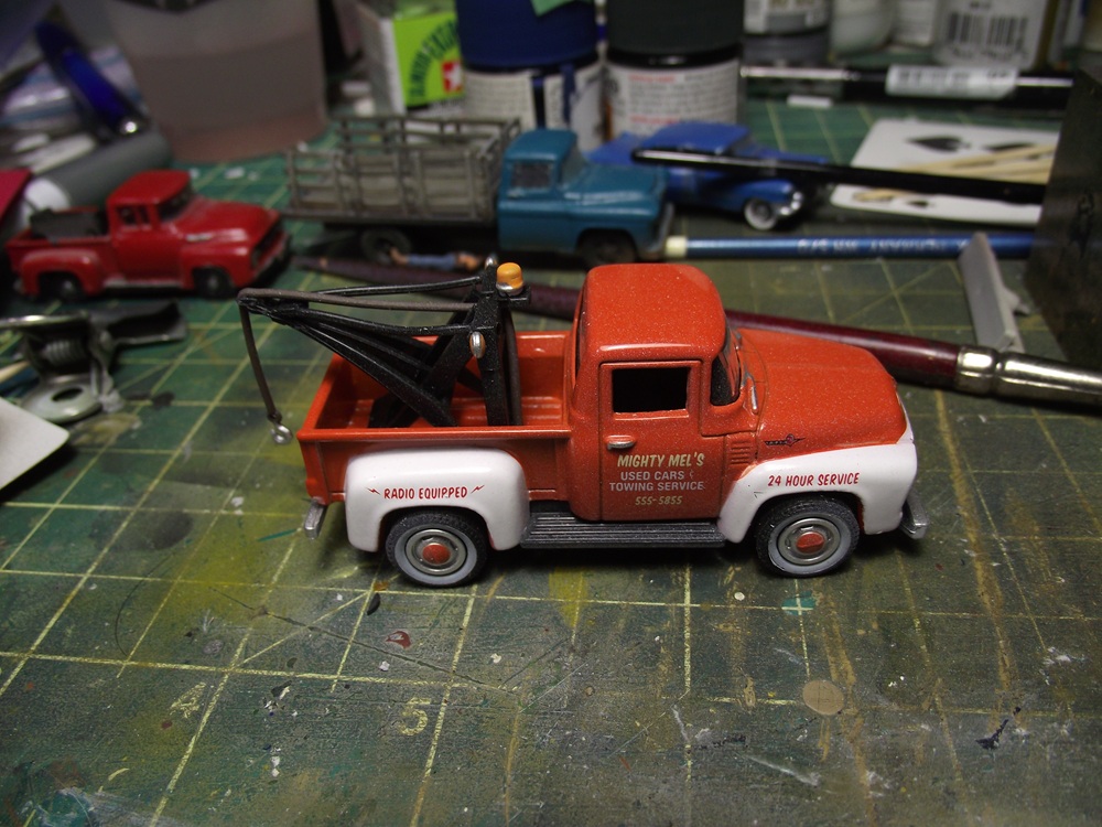 Then I glued the boom assembly onto the back of the wrecker as well as the wheels