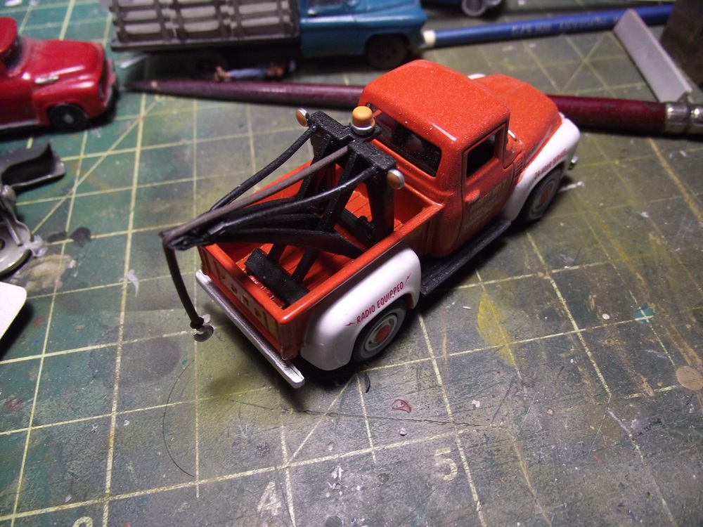 I built the boom and winch assembly. Starting with a die-cast tow truck (1/64 scale)