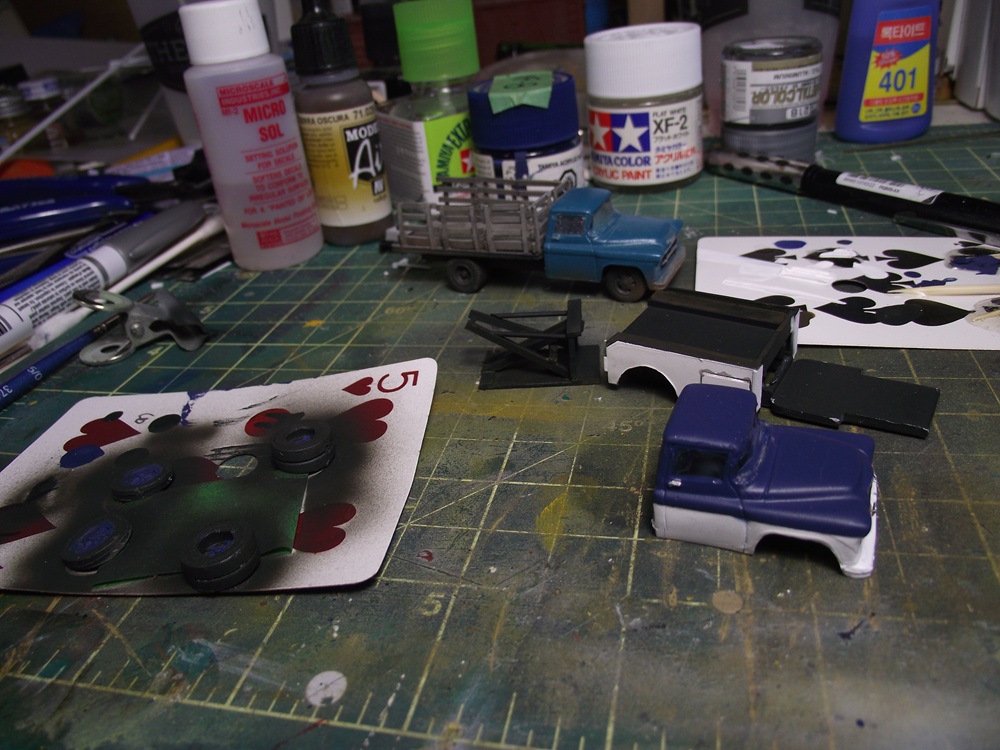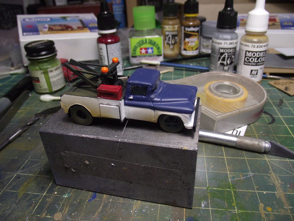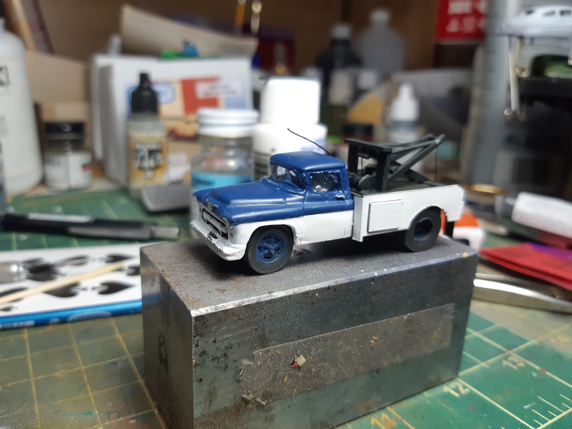 I used all Tamiya paints for a change, usually I'm airbrushing with Vallejo but I recently inherited a large collection of Tamiya paints and thinners. I painted everything in Flat white, then I masked off the lower 1/2 of the cab and painted the top in a darker blue. I masked off the sides of the wrecker body and painted the deck and boom assembly in flat black. The boom assembly was build to be installed after painting was finished I also hand painted the wheels in the same blue as the cab.
