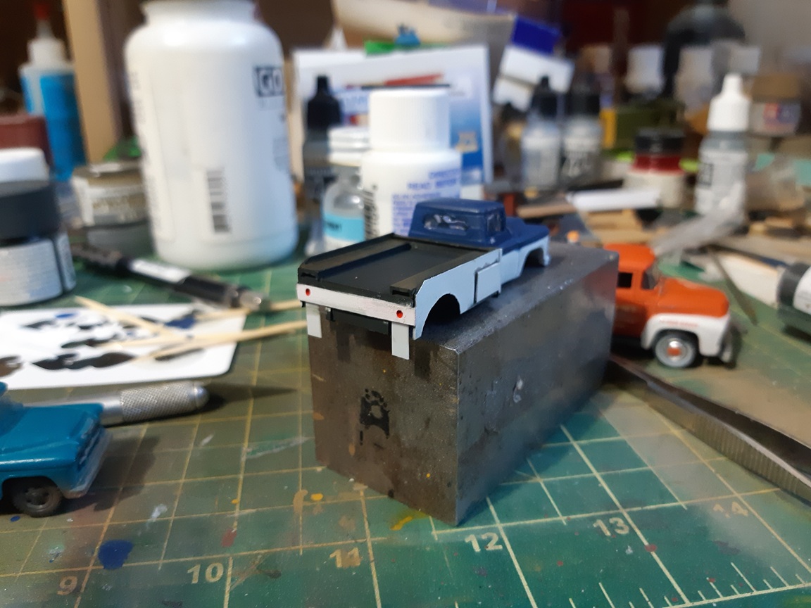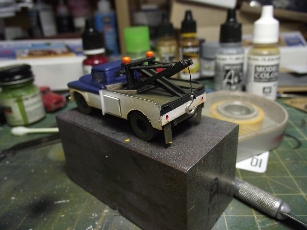 I started reassembly of the painted parts. I glued the cab and wrecker body to the chassis, then realized that I needed tailights and mudflaps. I drilled out the tailights in the rear valence and then used some 1X6 styrene strip for both the light backing and the mudflaps.