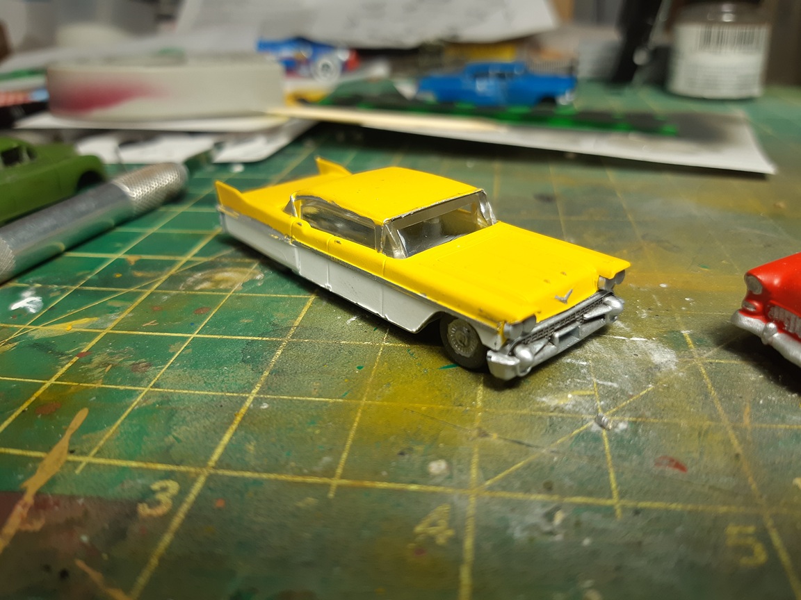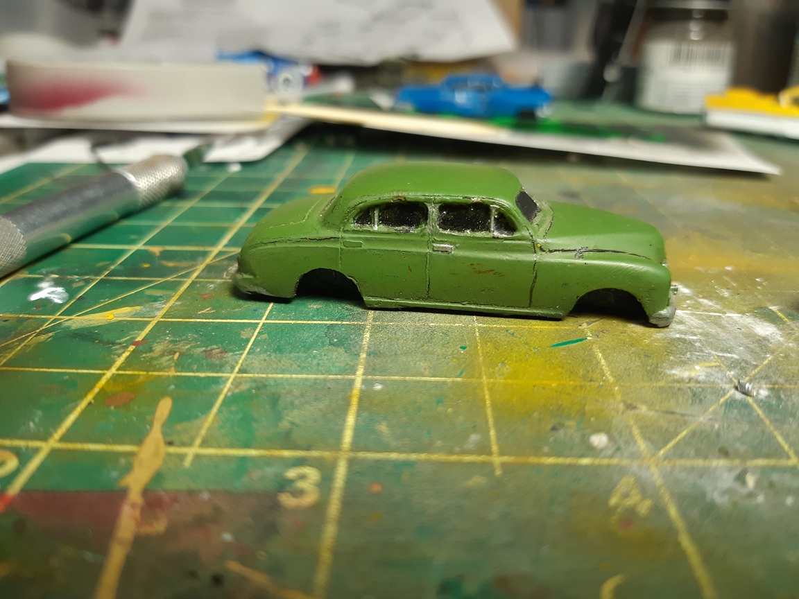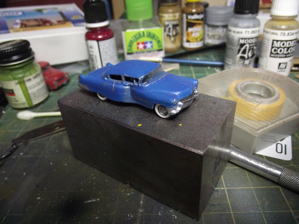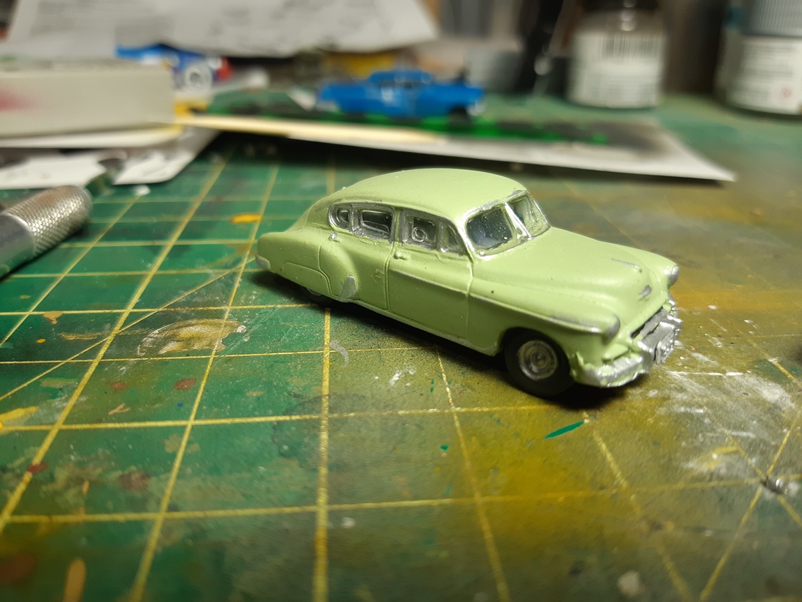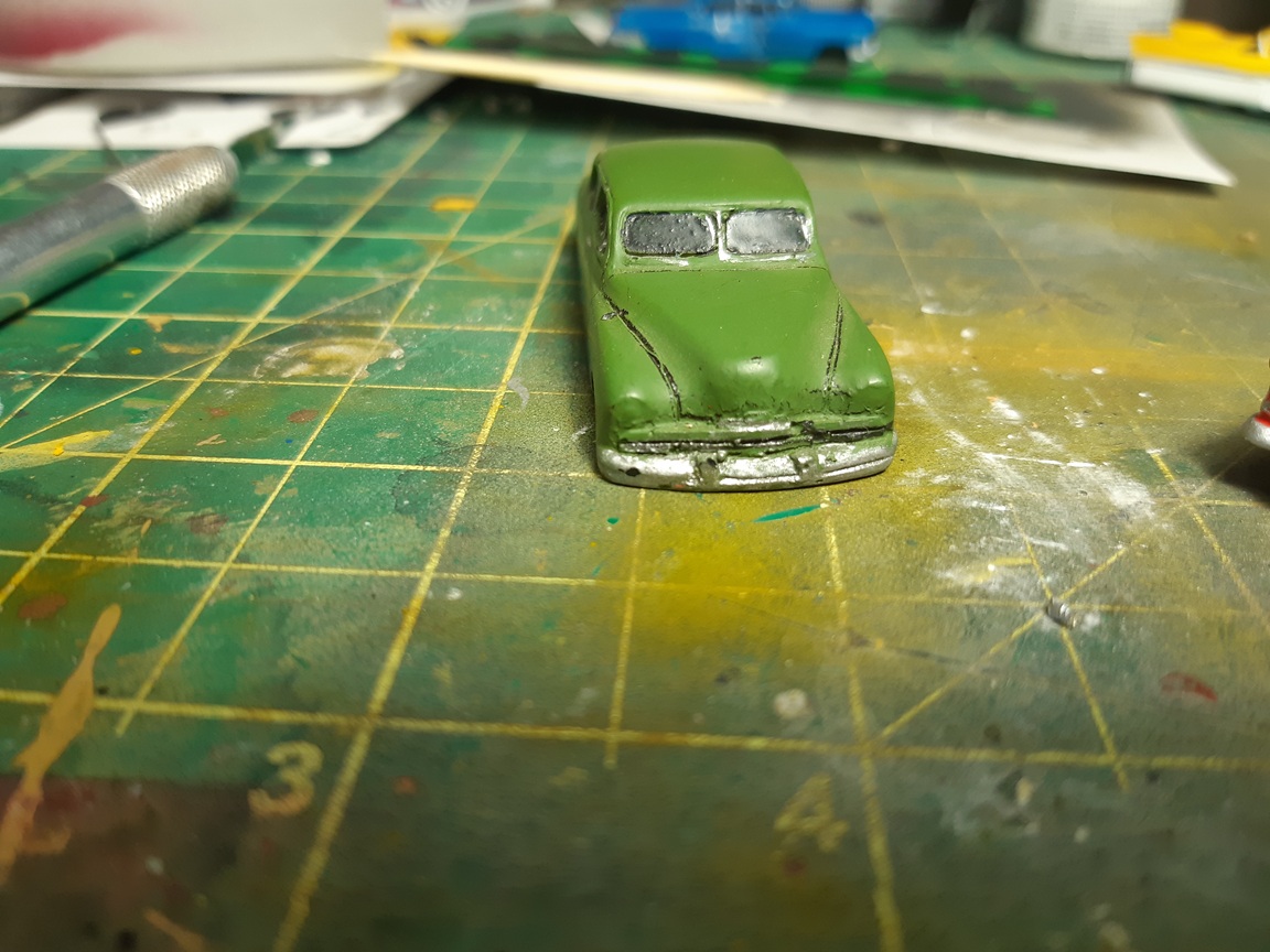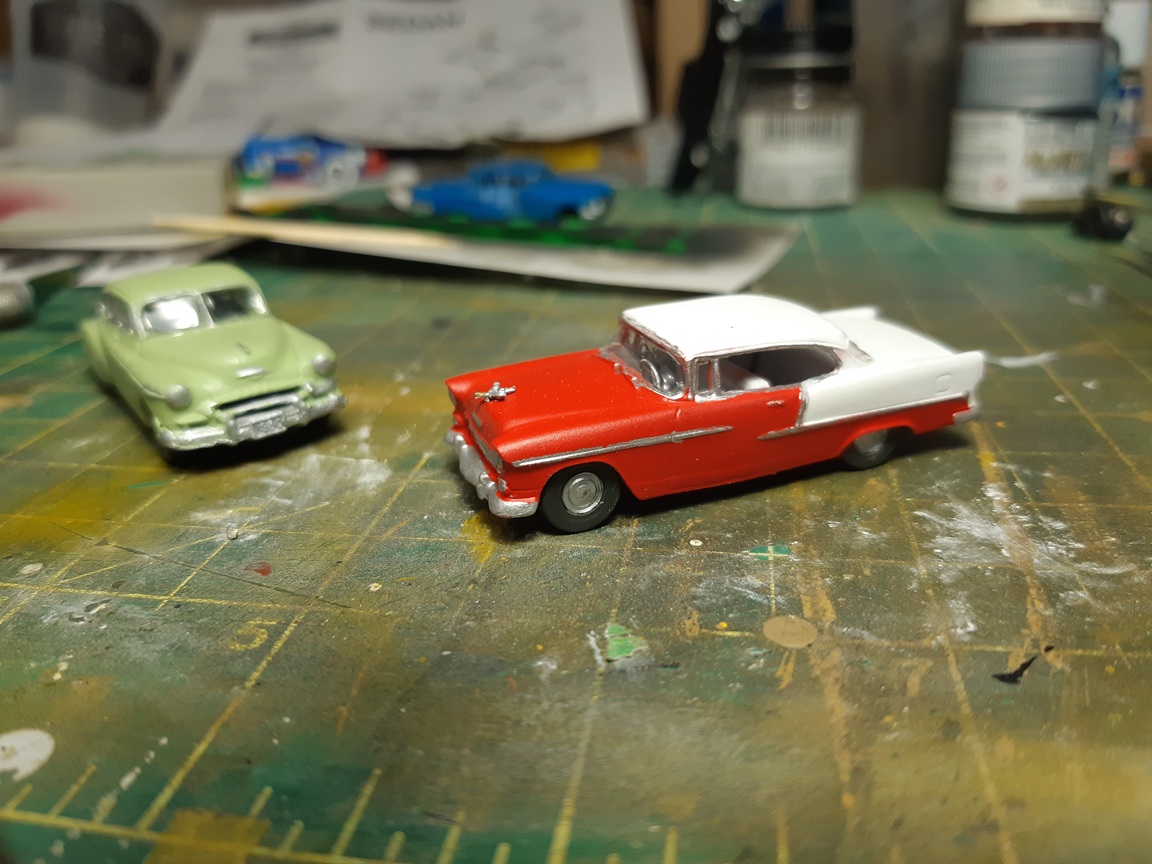 I've built a few more vehicles 1955 Chev bel air coupe. I two-toned it white and red. Masking something so small is fun. 1950 chev fleetline in light green This as an sedan made by Athearn. You used to be able to buy these in kit form at a dollar each. Theyt're pretty crude unless you want to put some extra work into them. They look similar to a late 50's buick I got this resin cast car in a collection. I believe it's a late 50's jaguar?