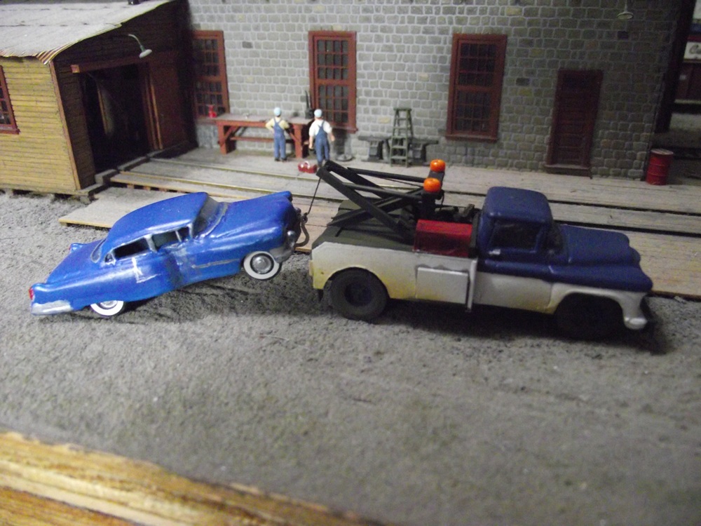 I finished the tow truck this week: I added the red toolbox on the side. It's just a plastic crate that I sanded the sides to fit. and I used some styrene 'c' channel to make the reinforced front bumper. on the other side I glued some wood blocking. I added the two beacon lights using some orange glass beads and painting them in a clear orange. The hook came from the scrapbox. I weathered the truck with some vallejo 'dirt' out of the airbrush. When you have a wrecker, you need a wrecked car. out of the same Junk Autos pack came this 55 cadilac shell. The t-boned dent was already there in the casting. O painted the shell and added the window glass. I made a new chassis out of styrene and cast four wheels for it. The hole drilled in the front is for the wrecker hook. And the completed combo. I'm continuing to work on both Alloy forms vehicles and other manufacturers' offerings. I'll post as I compete them.
