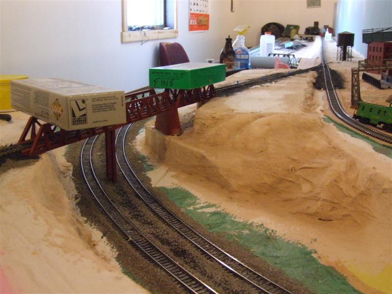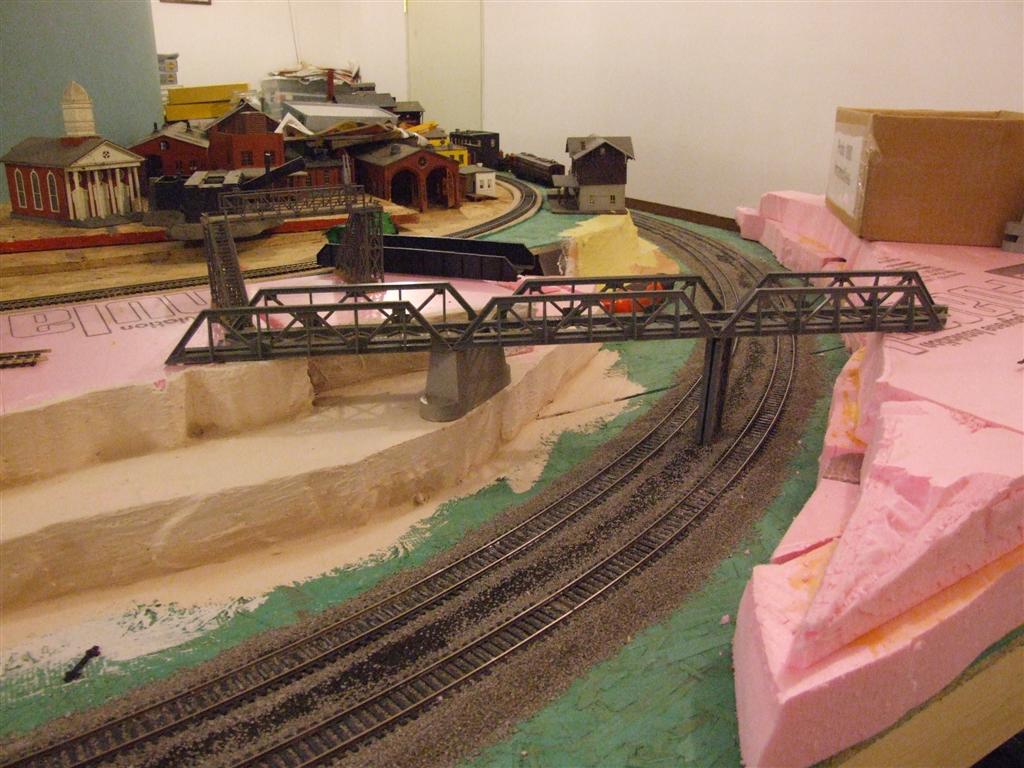 Today I decided one corner wasn't busy enough so I cut in a switch, laid down some 2 in foam board, and glued 3 old Tyco through truss bridges together so now I'll have a spot on a corner for another industry.