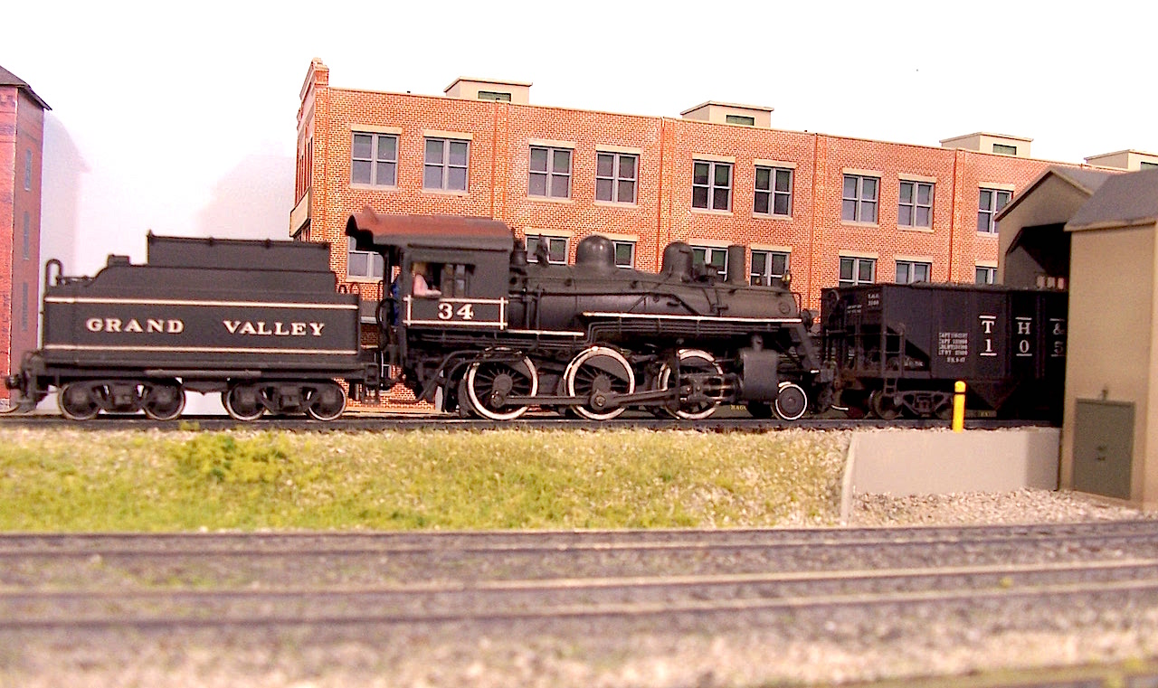 Here's the Grand Valley's 34, spotting a couple of hoppers at the Mount Forest coaling tower.....