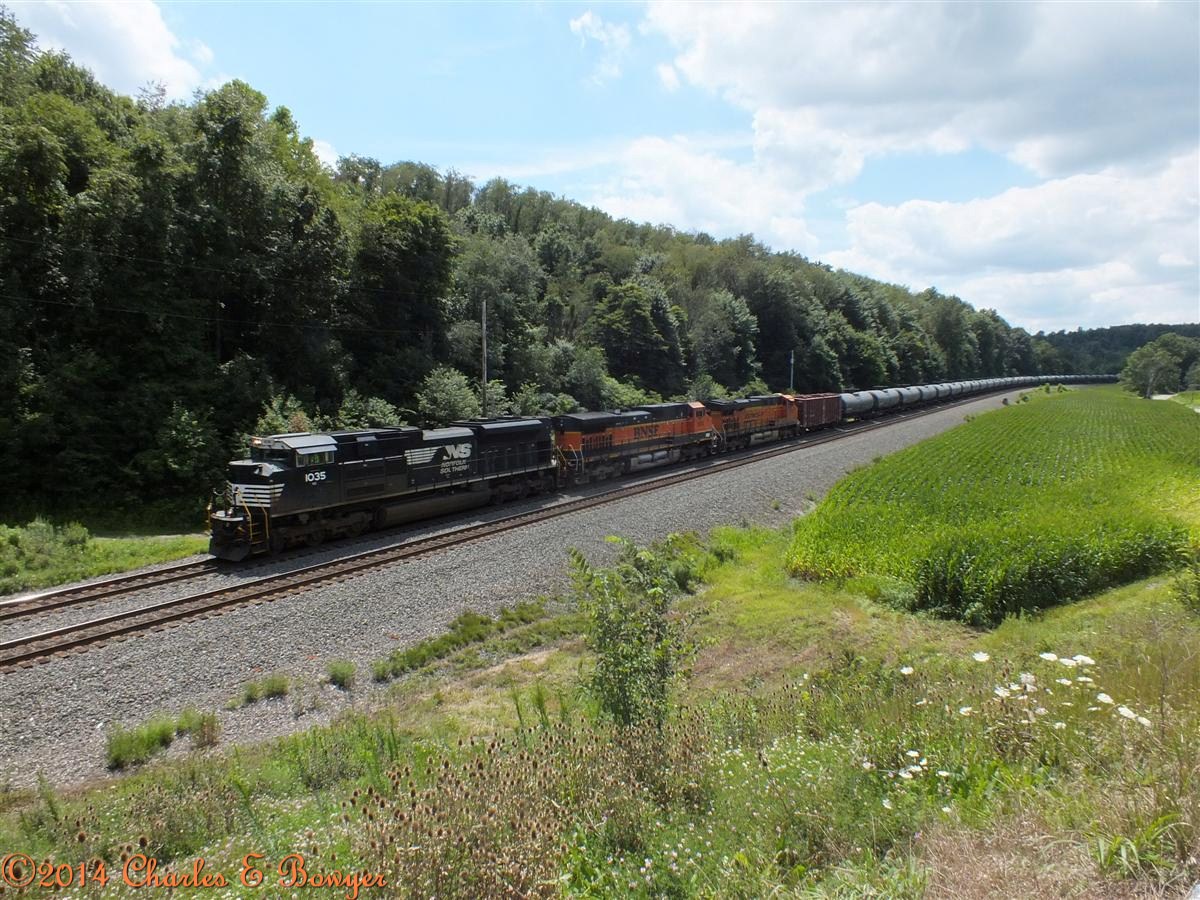 Just below Wellsville, Ohio Branch Interlocking is the switch to one leg of the wye at Yellow Creek, and it was controlled from Yellow Creek Tower. The helper set will assist a coal train that has just headed up the Branch track which connects to the Bayard branch at the other end of this leg. Very few trains use these tracks today.