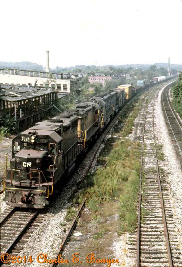 Conrail 7878 (GP38) leads an eastbound manifest past the remains of the W S George pottery in East Palestine, Oh. 8/28/1977