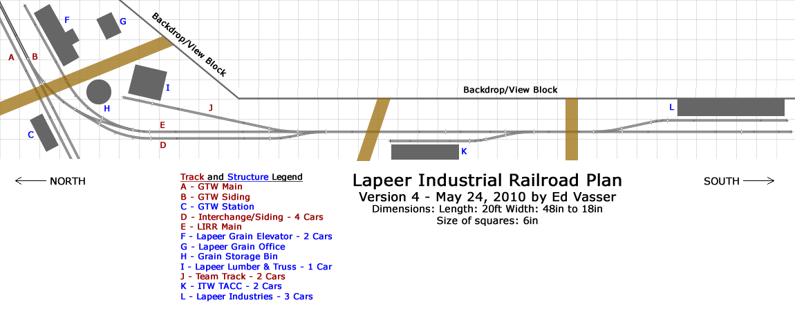 I included track representing both the GTW Main [A] and Siding [B] and still have plenty of room for the GTW Station [C]. I now have the siding for ITW TACC [K] facing the correct direction and on the the correct side of the "Main" track now. What I'm calling Lapeer Industries [L] is also oriented in the correct direction and on the correct side of the "Main". The real Lapeer Industries is actually located no where near the railroad, but there is a large structure in the location I have on the plan.