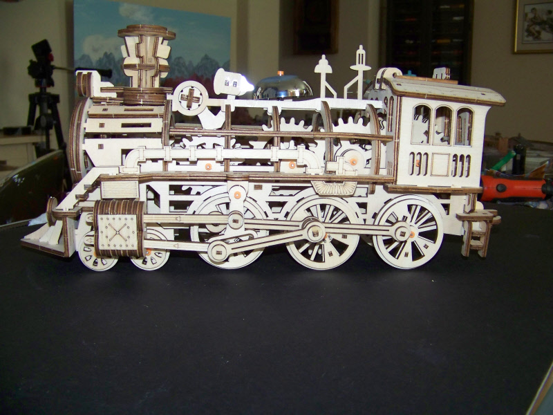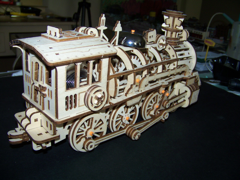Whoopie-do, hallelujah, I've gone past step 47, it's as done as it's gunna be. Will it ever run? Probably not. I cranked the winder a few days ago and I heard it go, "click, click", (good sound)  , and left it since I didn't want to stress anything. I could roll it and the gears all rotated. I put the rods on, the last few steps and now the gears seem to be frozen. I cranked the winder and instead of a "click", I got a loud "SPROING" (not a good sound)  , meaning that the winder shaft has broken free of the ratchet gear. When I rotate the engine to look at the underside, tabs and other connections come apart, especially the drive rods from the wheels. Maybe some more glue, but at this point I'm just joyous that I finished the $%!#!&@ thing. especially that I got the sagging front end to come up a little more, almost level. Basically, when it does run, the smokestack should rotate and the bell goes gong-gong-gong... Oh yeah, the engine should move forward too...