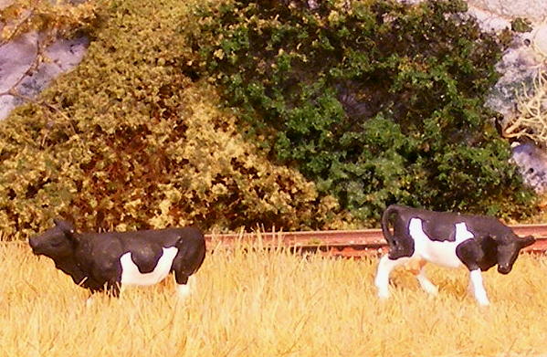 I have an HO mat that is supposed to represent field grass. However it's too tall for an N scale pasture as you can see by the cow on the left. The cow on the right had her field shaved