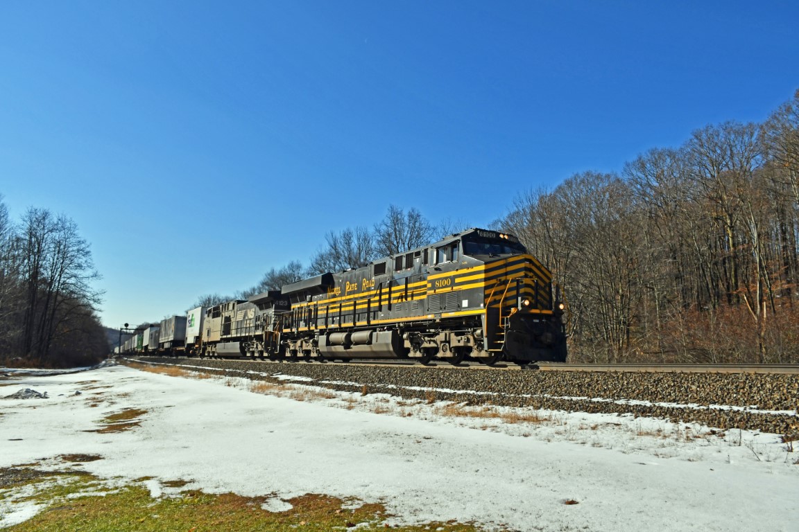 8100 on 22W is seen today y(12-2-18) East through Lily, Pennsylvania on an Intermodal train.