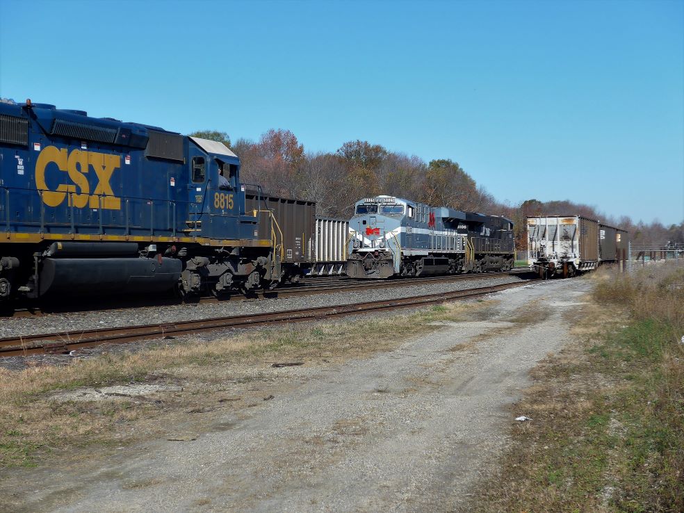 Conrail's CA-11 passing the engine power for Norfolk Southern's coal train NS 506/507 at Carneys Point, NJ, 11/16/15.