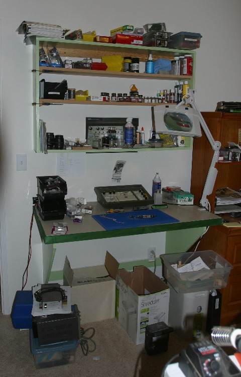 Here is a photo of my work area. The counter features a corain top and a duel light magnifier. It share a bedroom with the computer desk, photo equipment and a small layout I'm fussing with. The woodworking machines and tools live in the garage and the truck lives outside. Eek