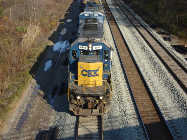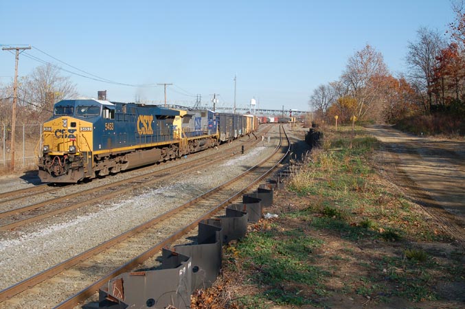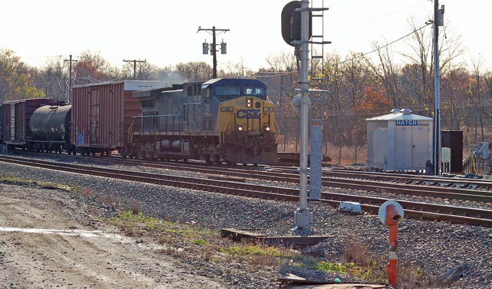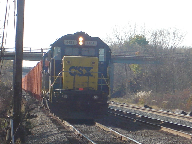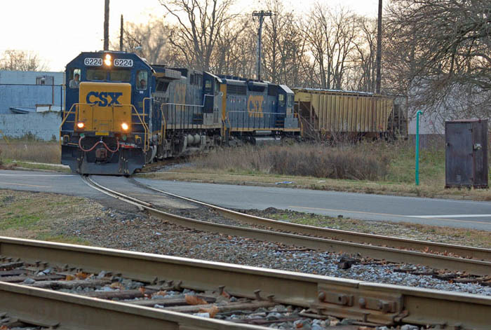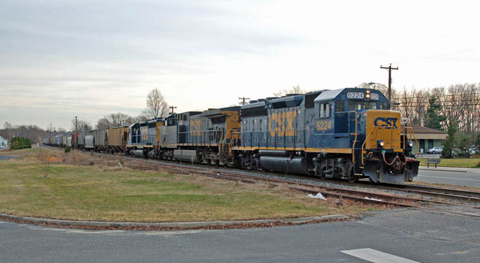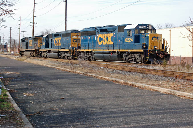The Winchester and Western had an 86 car grain train for Conrail today. CR sent down a trio of CSX units, GP 40-2, CW44AC and a SD 40-2. Its unusual to see six axle units on the Vineland Industrial Track, but this was an unusual move. First two pics are at Vineland and the last at Newfield, NJ Dec 14 2009.