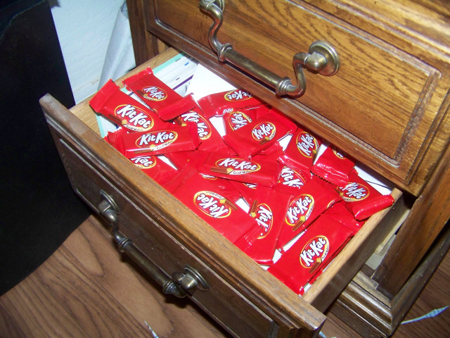 Catt Wrote:Eating Kit Kats? How do we do that ? Ed keeps buying all of them and hiding them in his desk. Eek