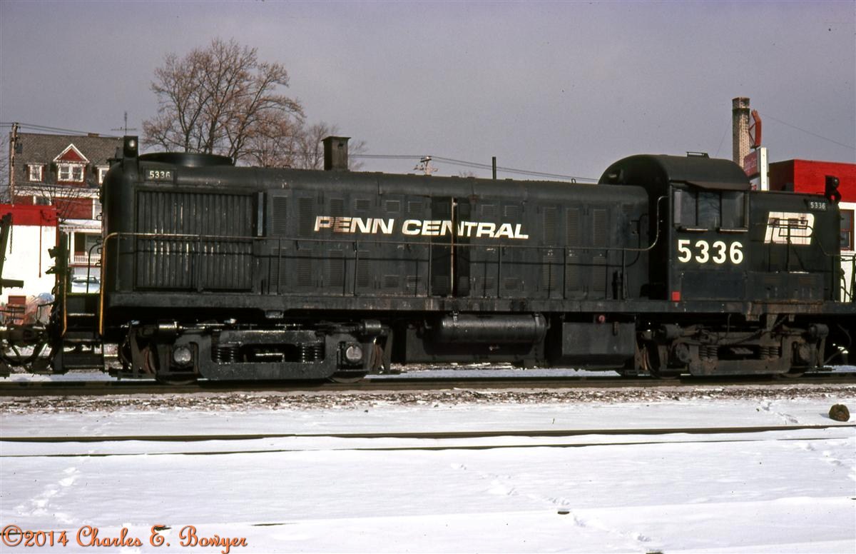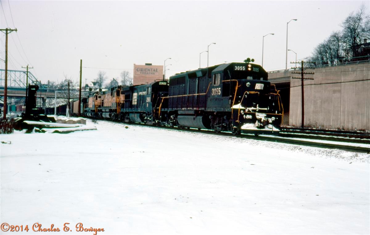 A consist of PC and Reading units head a mixed freight toward Conway on Jan. 2, 1977. The Oriental theater is long gone.