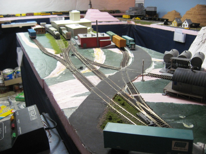First up is the updated overall view of the industrial area. As you can see I've added some roads and started some scenery. I used WS "Smooth-it" for the roads and I must say it works very well. Once the roads were dry I sanded them smooth and painted them. Lines on the road will probably be one of the last things added.