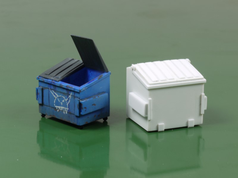 With the dumpsters made from wood as a Carpenter/Cabinetmaker I will suggest the following for those wishing to use that technique; choose the finest grain wood you can find, use the highest tooth number saw blade and cut slooowly to reduce tearout, then sand with coarse 80 grit, medium 120 grit and fine 240 grit sandpaper, using blocks and jigs to keep things square, prime then resand to remove fluffing, add details and continue. Actually it maybe better to size up and then sand the blank before cutting into little blocks and finishing the sanding.