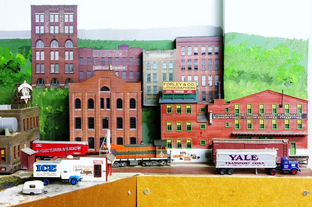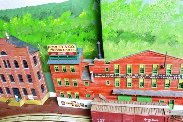 If you control your photo angles, you may be able to add a representation of "a road going up a hill" between Forley and the Walthers building. If there's sufficient depth, a piece of cardstock or sheet styrene with, hopefully, a short flat section between the tracks and the backdrop. Allow the "road" to curve and disappear to the left, then plant a two dimensional tree at the area where Forley's meets the Kingmill structure behind it.