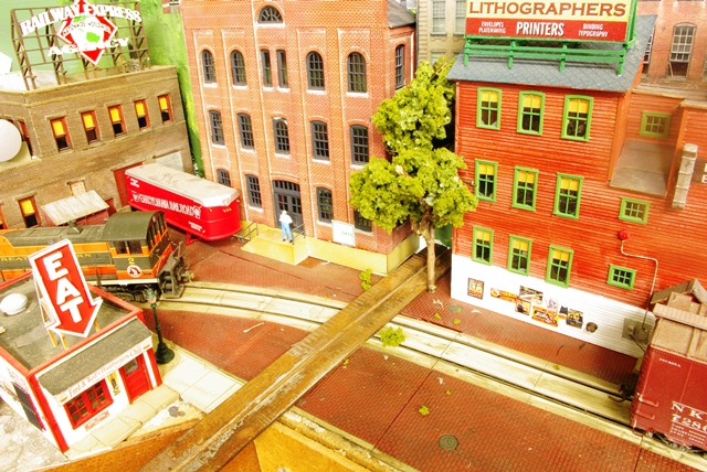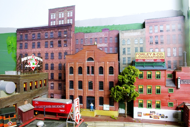 I cut that particular Commerce Street set in two and glued the rest of the set directly to the backdrop -- no choice here due to the lack of space in that area.
