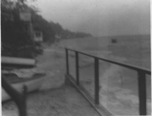 If you follow the line of the railing on the top of the concrete block wall, to the left, there's a white wall, with two windows, and no support under it. Hurricane Carol ( 1954 ) took out the foundation ! The concrete block wall which was in front of our summer cottage, was taken shortly after this picture was shot. That wall was our last defense against the storm. Fortunately, the storm passed before the cottage, and all of us, would have gone into the bay.